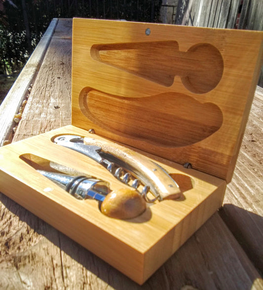 Sacacorchos y tapón de vino personalizados en caja de bambú